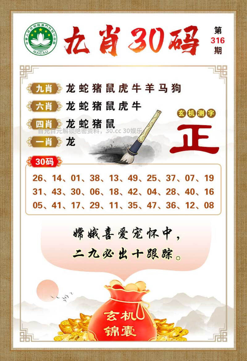 | 316期:九肖 | 狗鸡猪牛兔鼠马蛇虎 | 开:马24 |